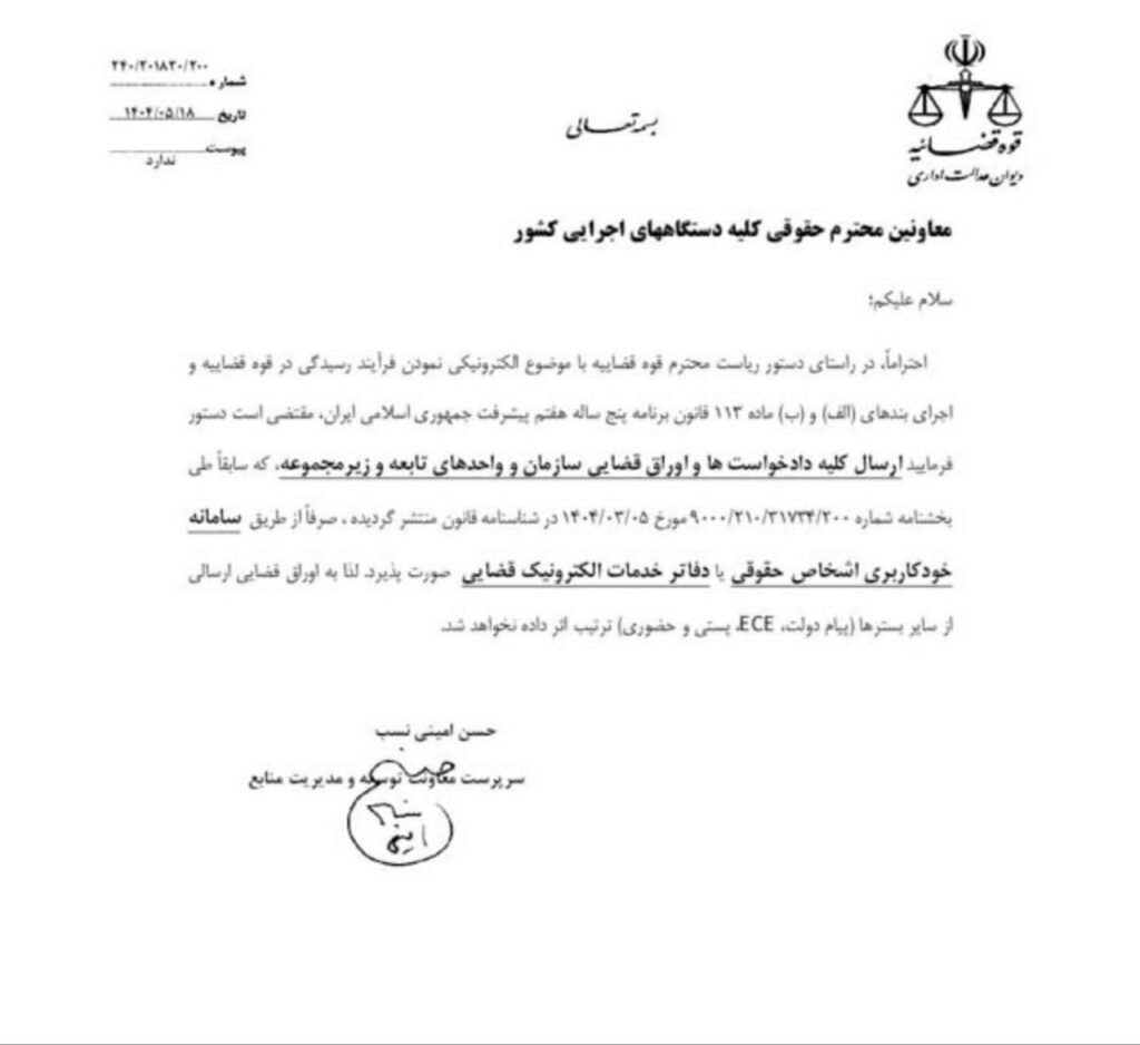 الزام کلیه دستگاههای اجرایی به ارسال مکاتبات از طریق سامانه خودکاربری اشخاص حقوقی یا دفاتر خدمات الکترونیک قضایی